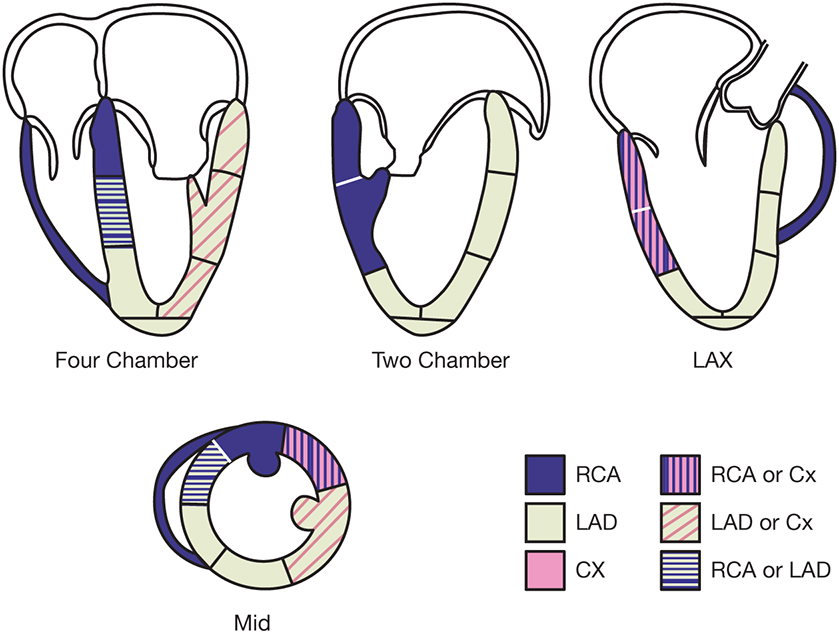 Wall segments of the LV. CX, circumflex; LAD, left anterior descending; LAX, long axis; LV, left ventricle; RCA, right coronary artery. (Reprinted from Lang RM, Bierig M, Devereux RB, et al. Recommendations for chamber quantification: a report from the American Society of Echocardiography's Guidelines and Standards Committee and the Chamber Quantification Writing Group, developed in conjunction with the European Association of Echocardiography, a branch of the European Society of Cardiology. J Am Soc Echocardiogr. 2005;18:1440-1463. Copyright © 2005 American Society of Echocardiography. With permission.)