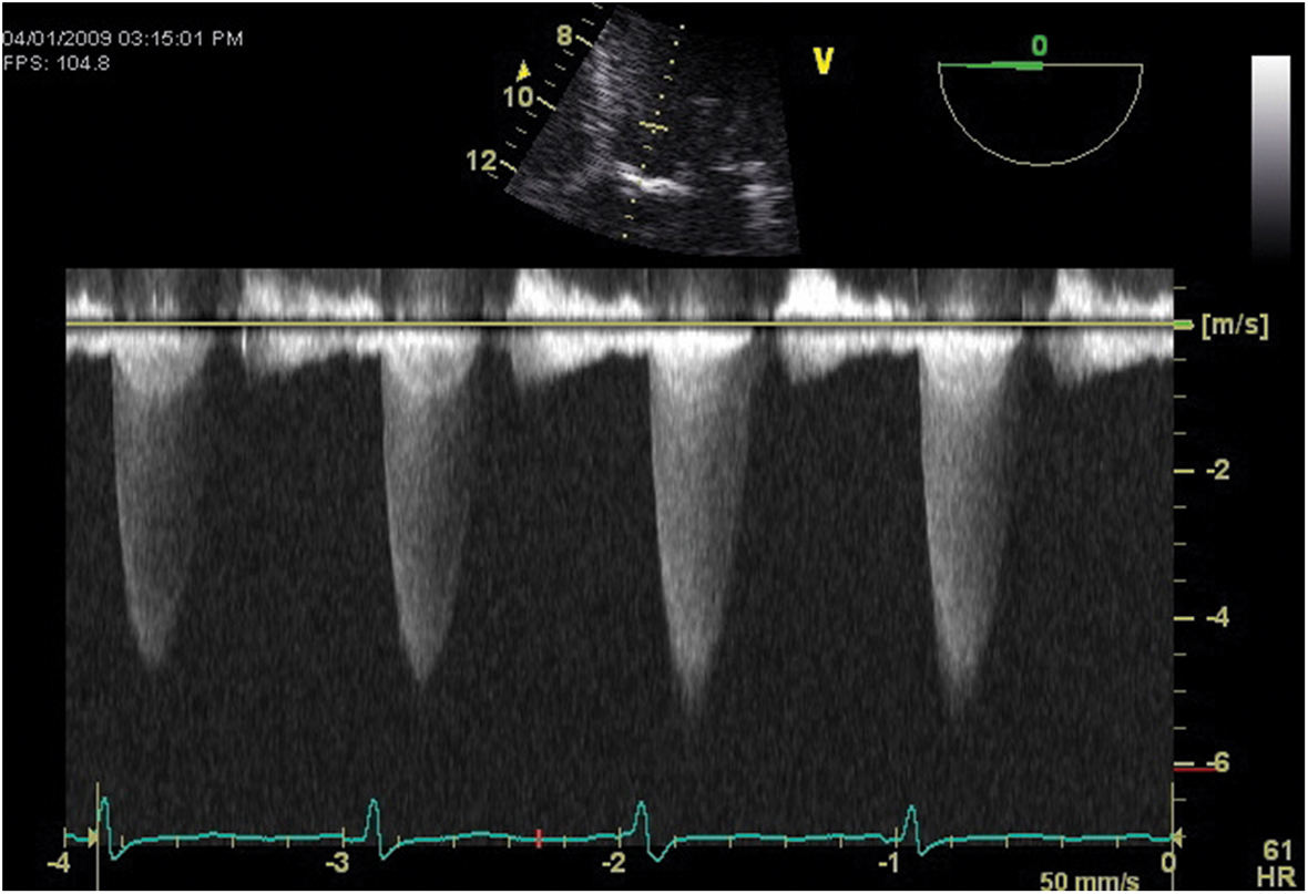 Continuous-wave Doppler across the aortic valve in the deep transgastric apical view from a patient with severe aortic stenosis.
