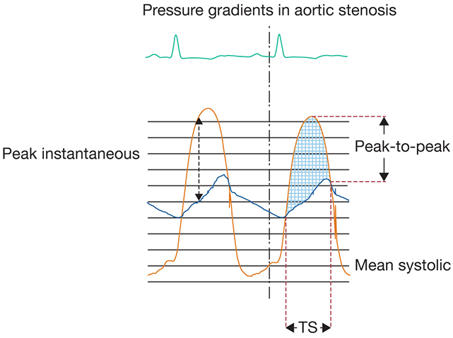Pressure gradients in severe aortic stenosis are measured during systole as the difference between aortic and left ventricular pressures displayed using a scale of 0 to 20 mm Hg. The peak instantaneous gradient is the maximum gradient noted; the peak-to-peak gradient is the difference between peak left ventricular and aortic pressures. The mean systolic gradient is the average of all systolic pressure gradients noted during systolic ejection (TS). (Adapted with permission from Nanda NC, ed. Doppler Echocardiography. Lea & Febiger; 1993:130.)