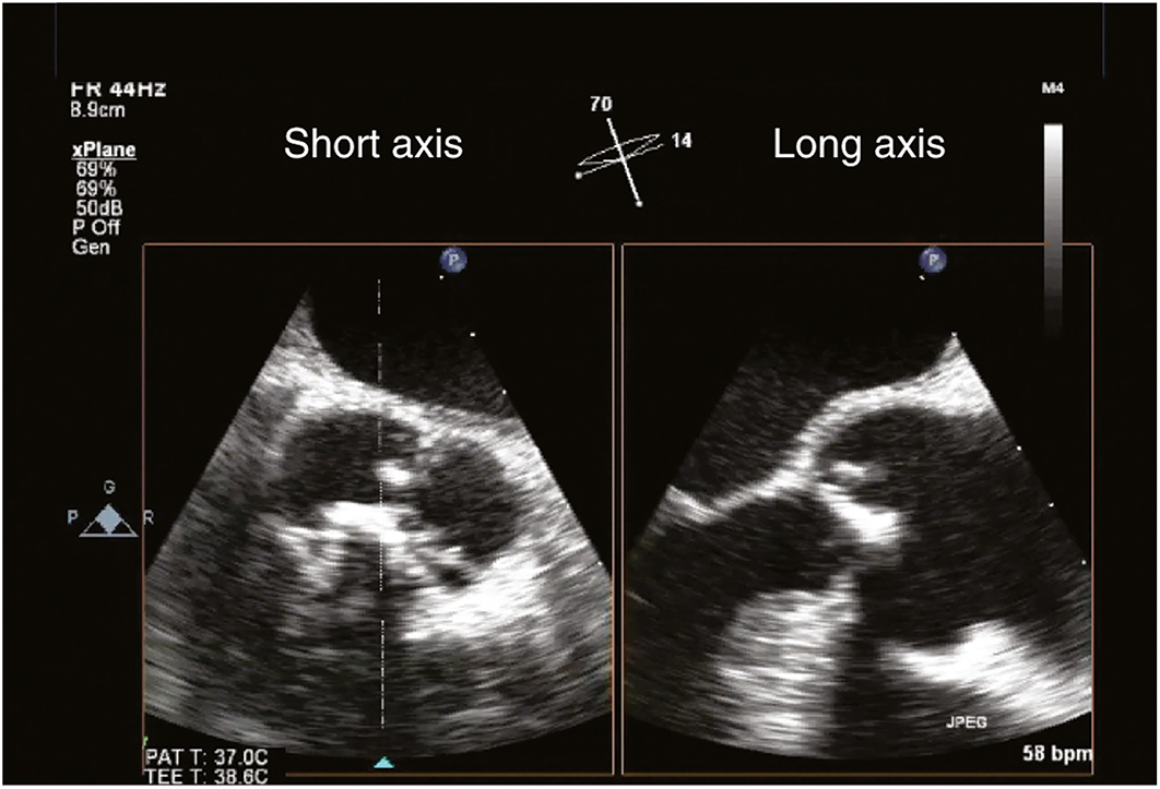 Transesophageal echocardiographic findings of moderate aortic stenosis (midesophageal aortic valve [AV] short-axis view [left] and long-axis view [right]). The AV cusps are calcified and demonstrate limited systolic excursion.
