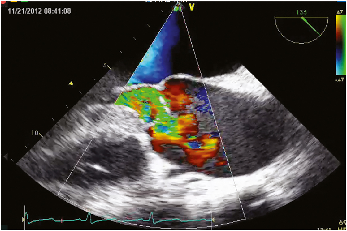 Catheterization criteria for AI rely on the qualitative estimation of the regurgitation volume and estimation of left ventricular size and ejection fraction. Similar quantification can be made from Doppler color echocardiography-derived data. The width of the regurgitant jet at the level of the AV can be compared to the width of the LVOT. A ratio of more than 0.6 corresponds to severe AI (Figure 7.17; Video 7.2). Another sign of severe AI is diastolic flow reversal of the descending thoracic aorta, as observed on spectral Doppler.