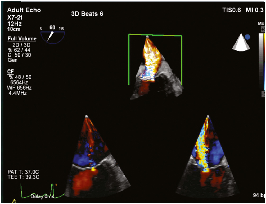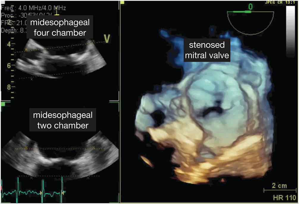 Transesophageal echocardiographic findings of moderate mitral stenosis (color flow Doppler) with 3D view (top) and 2D view (bottom).