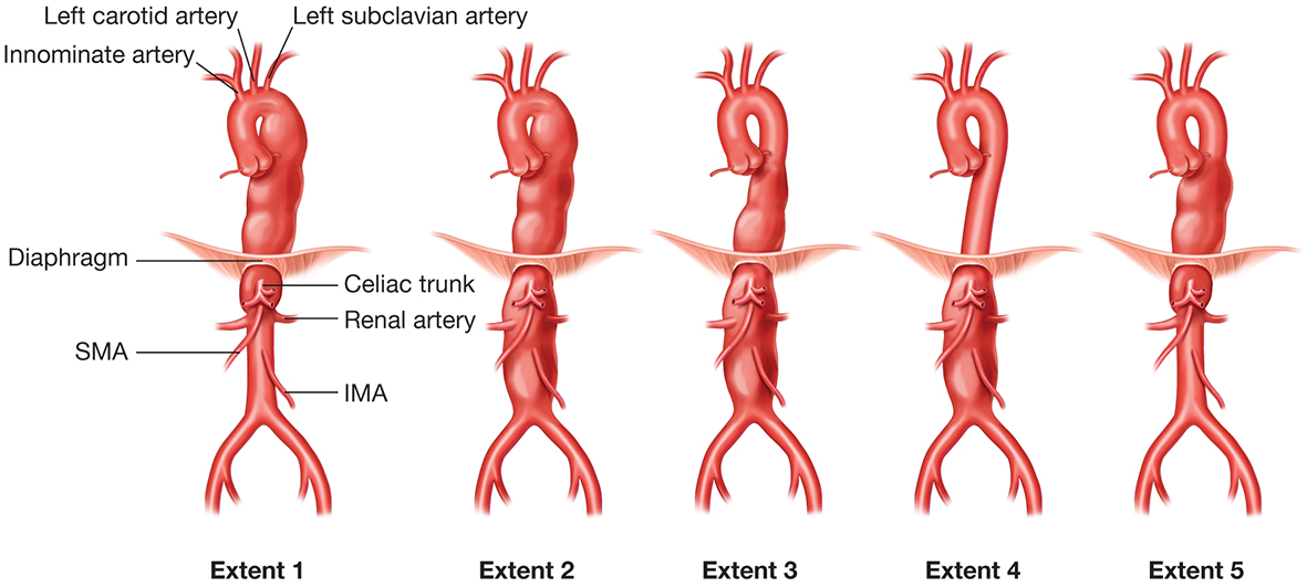 TAAs do not follow a specific classification system but are described by the extent of the aorta that is involved, including the aortic root, ascending aorta, aortic arch, and descending thoracic aorta. TAAAs are described using the modified Crawford classification, which subdivides TAAAs into five types according to the extent of the surgical repair required (Figure 9.4).
