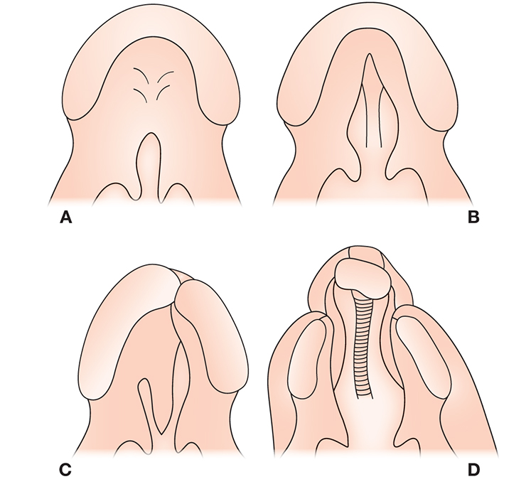 Various degrees of cleft palate and cleft lip. A. Cleft of the soft palate only. B. Cleft of the soft and hard palate as far forward as the incisive foramen. C. Complete unilateral alveolar cleft, usually involving the lip. D. Complete bilateral alveolar cleft, usually associated with bilateral clefts of the lip. (Modified from McCarthy JG, Cutting CB, Jogan VM. Introduction to Facial Clefts. In: McCarthy JG, ed. Plastic Surgery. Vol. 4: Cleft Lip and Palate and Craniofacial Abnormalities. WB Saunders; 1990: 2443.)