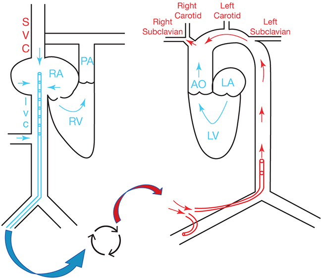 VA-ECMO is akin to conventional CPB, in which blood is drained via a cannula placed in the right atrium or inferior vena cava, routed to a pump and an oxygenator/heat exchanger, and returned to the aorta or a large artery (Figures 6.5 and 6.6). As a result, both cardiac and pulmonary support is achieved. The indications for VA-ECMO include post-cardiotomy shock/failure to wean from CPB, reversible cardiogenic shock, as a bridge to a durable ventricular support device, as a bridge to transplantation, and as an adjunct to advanced life support for cardiac arrest (ie, extracorporeal cardiopulmonary resuscitation [ECPR]).