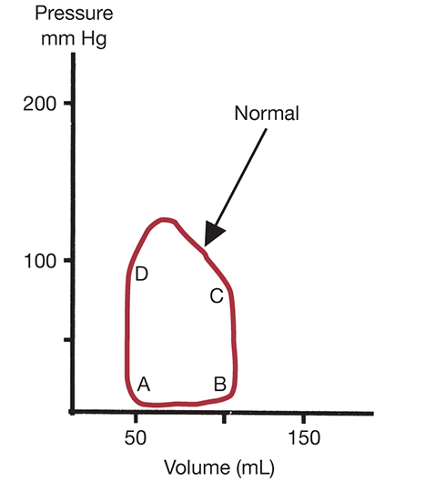 Normal P-V loop and valve positions. A, mitral valve (MV) opening; AB, left ventricular filling; B, MV closure; BC, isovolumetric contraction; C, aortic valve (AV) opening; CD, ejection; D, AV closure; DA, isovolumetric relaxation.