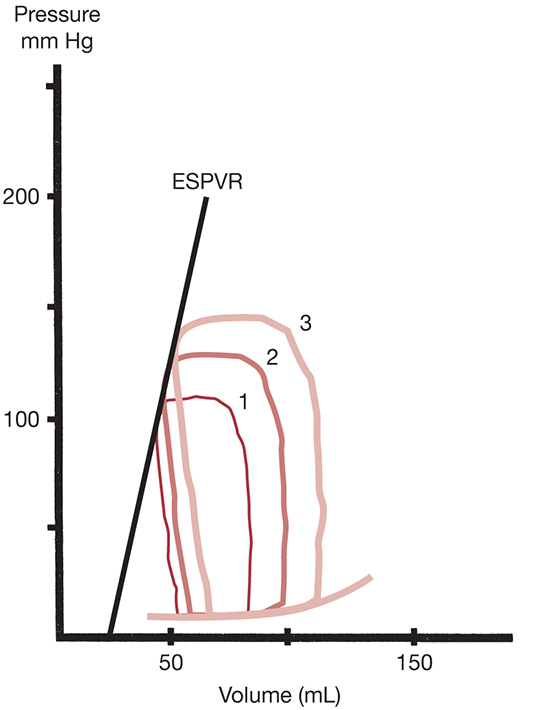 The P-V loop (Figure 7.1) depicts the relation between ventricular volume and pressure during a single cardiac cycle. Opening and closing of the MV and AV are represented by the inflection points A, B, C, and D, respectively (Figure 7.1). Moving from points A to D, AB depicts left ventricular filling, BC depicts isovolumetric contraction, CD shows left ventricular ejection, and DA shows isovolumetric relaxation. Point A coincides with opening of the MV and represents left ventricular end-systolic volume and early diastolic pressure. Point B is closure of the MV and the relationship of end-diastolic pressure (LVEDP) and volume (left ventricular end-diastolic volume [LVEDV]). Point C represents the opening of the AV and coincides with systemic, aortic diastolic pressure. Finally, point D is the closure of the AV and represents left ventricular end-systolic pressure (LVESP) and volume (LVESV), coinciding with the dicrotic notch in the aortic pressure tracing (Figure 7.1). Left ventricular compliance is the relation between pressure and volume and is defined by the slope of the filling phase (segment AB). Preload is the P-V relation before the onset of contraction (LVEDP). Contractility may be illustrated by the slope of the end-systolic pressure-volume relation (ESPVR). The ESPVR slope is created by connecting multiple points (D) from multiple P-V loops generated by changing the filling volume to the LV (Figure 7.2). Increased contractility results in a steeper slope, whereas diminished contractility results in a shallower slope. The P-V loop analysis permits illustration of stroke volume and ejection fraction. Stroke volume is defined as difference in volume from the end of filling to the end of ejection (EDV-ESV), whereas the ejection fraction is the ratio of stroke volume to total volume in the heart at peak filling (SV/EDV). Therefore, the P-V loop analysis permits illustration of the volume-pressure relations and their changes with each of the four valvular lesions.