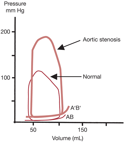 The hallmarks of AS, illustrated by the P-V loop analysis, are an increased left ventricular systolic pressure and an upward and counterclockwise rotation in the end-diastolic P-V relation (AB) indicative of decreased chamber compliance (Figure 7.3). Stroke volume and ejection fraction are well preserved, but the ejection phase of the loop occurs at much higher pressures. This is accomplished by an increase in contractility (counterclockwise rotation of the ESPVR).