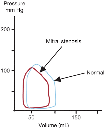 The P-V loop of MS illustrates hypovolemia, the cause of which cannot be determined from the loop alone (Figure 7.5). Because the predominant impact of MS occurs proximal to the LV, the P-V analysis format is less useful.
