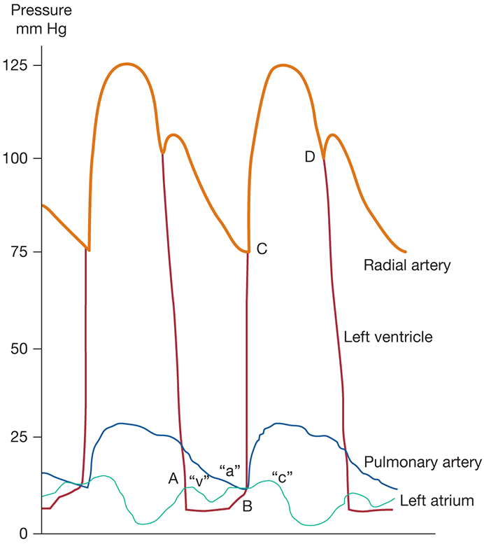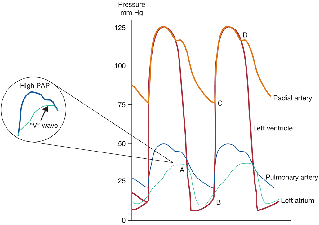 The hallmark of MR is the marked elevations of left atrial pressure during systole and the occurrence of a giant "cv" wave and elevated PA pressures (Figure 7.11).