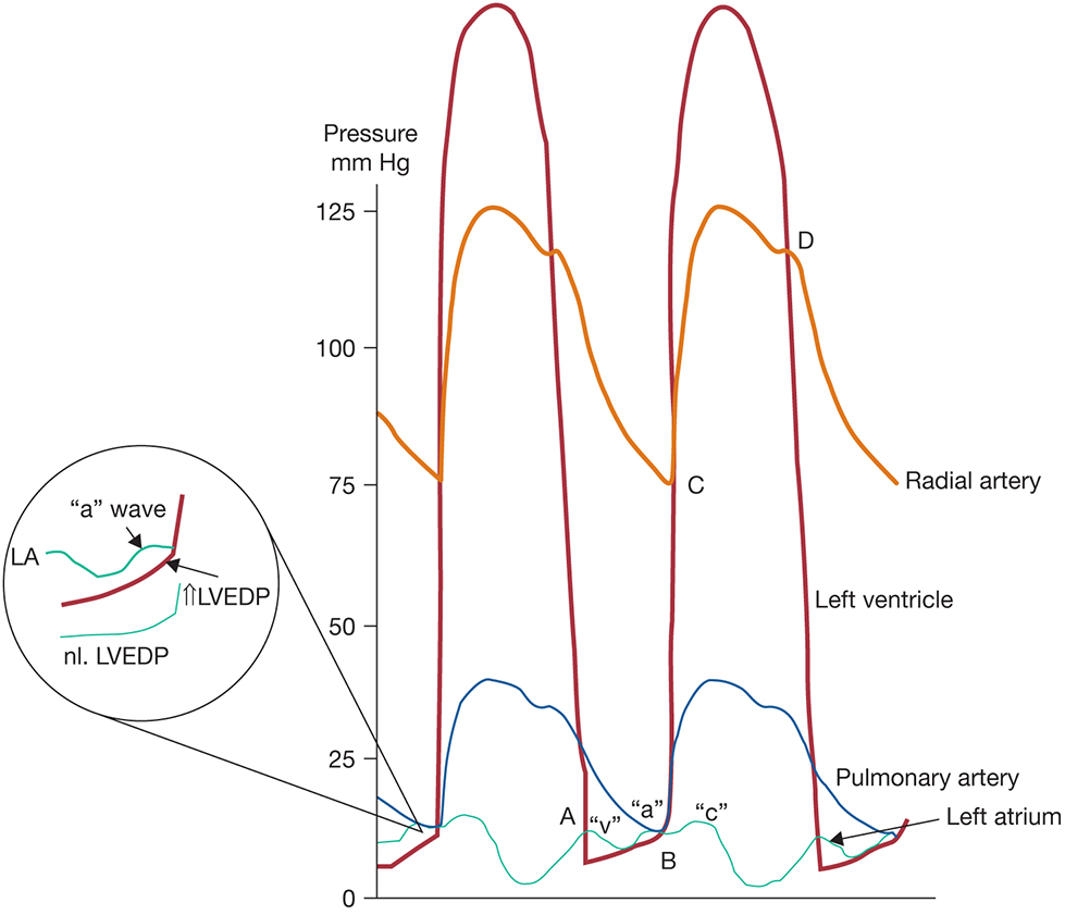 Pressure curves for the LV, left atrium (LA), pulmonary artery, and aorta in patients with aortic stenosis. LVEDP, left ventricular end-diastolic pressure.