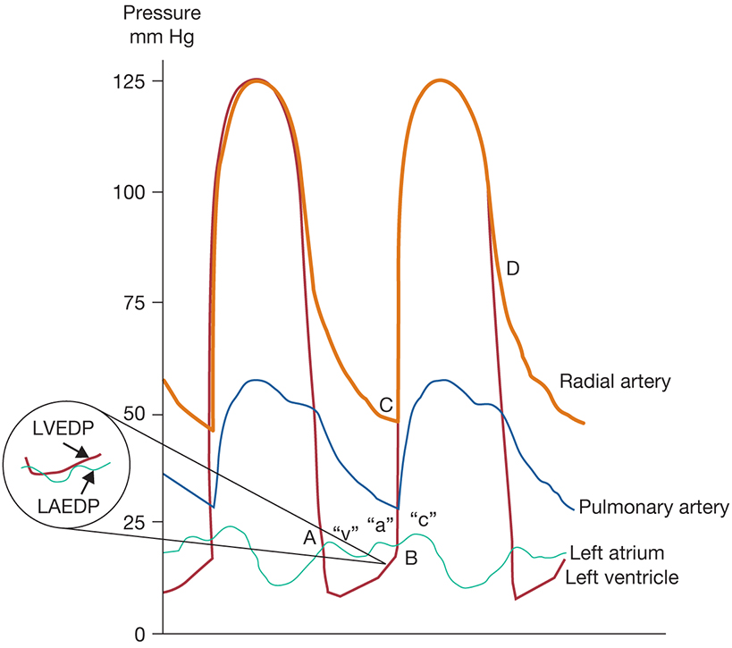 Pressure curves for the LV, left atrium, pulmonary artery, and aorta in patients with aortic regurgitation. LAEDP, left atrium end-diastolic pressure; LVEDP, left ventricular end-diastolic pressure.