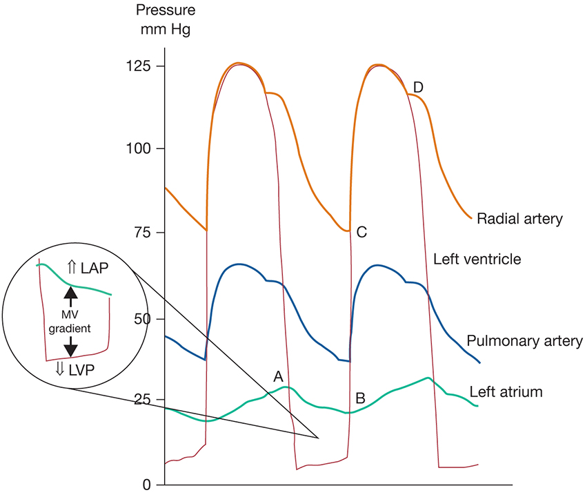 Elevations in pressure are seen in both the left atrial and PA tracing with MS (Figure 7.10). The large gradient between left atrial and left ventricular pressures is highlighted in the inset. Chronic elevation in pulmonary volume induces changes the pulmonary arterial vascular bed and results in pulmonary hypertension.