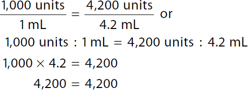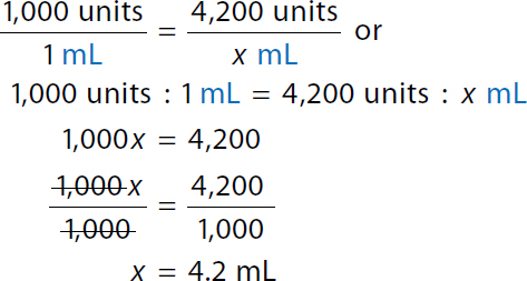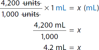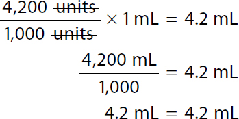 Because the calculated dose, 4,200 units, accurately completes the (Step 1) equation and is consistent with the approximated dose, the answer is confirmed. Because the calculated volume, 4.2 mL, accurately completes the (Step 2) equation and is consistent with the approximated volume, the answer is confirmed.
