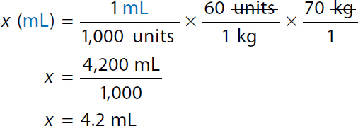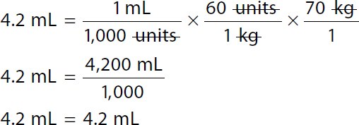 Steps 1 and 2 are combined: A calculation to determine the volume to administer bolus dose in milliliters using dimensional analysis. Calculation reads, 4.2 milliliters equals 1 milliliter over 1,000 units times 60 units over 1 kilogram times 70 kilograms over 1. In both the numerator and the denominator units and kilograms canceled each other. 4.2 milliliters equals 4,200 milliliters over 1,000. 4.2 milliliters equals 4.2 milliliters. |