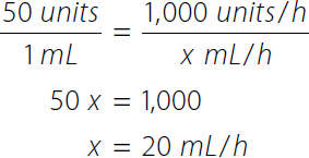 Clinical CLUE 14-5To calculate the infusion rate for an hourly dose of medication, such as heparin 1,000 units/h, using ratio-proportion, the left ratio will be the supply (IV solution: ![]() ![]()