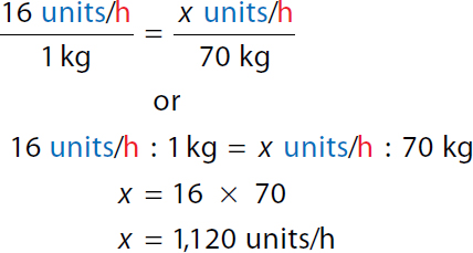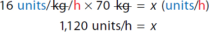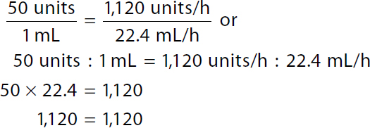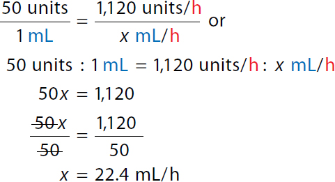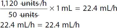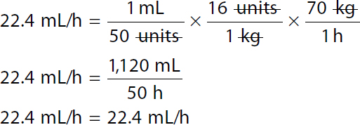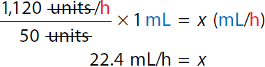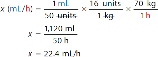 Step 1: Calculate the dose in units/h: Calculation reads, 16 units per hour over 1 kilogram equals x units per hour over 70 kilograms or a ratio of 16 units per hour to 1 kilogram equals ratio of x units per hour to 70 kilograms. x equals 16 times 70. x equals 1,120 units per hour. The patient's dose is 1,120 units/h. Step 2: Calculate the rate in mL/h: A calculation to set the Ratio-Proportion to determine the infusion rate. Calculation reads, 50 units over 1 milliliter equals 1,120 units per hour over x milliliter per hour or a ratio of 50 units to 1 milliliter equals 1,120 units per hour to x milliliters per hour. 50 x equals 1,120. 50 x over 50 equals 1,120 over 50. In both the numerator and the denominator 50 canceled each other. x equals 22.4 milliliters per hour. The infusion rate is 22.4 mL/h. | Step 1: Calculate the dose in units/h: Calculation reads, 16 units kilogram per hour times 70 kilograms equals x units per hour to 1,120 units per hour. The patient's dose is 1,120 units/h. Step 2: Calculate the rate in mL/h: Calculation reads, 1120 units per hour over 50 units times 1 milliliter equals x milliliter per hour. 22.4 milliliters per hour equals x. The infusion rate is 22.4 mL/h. |