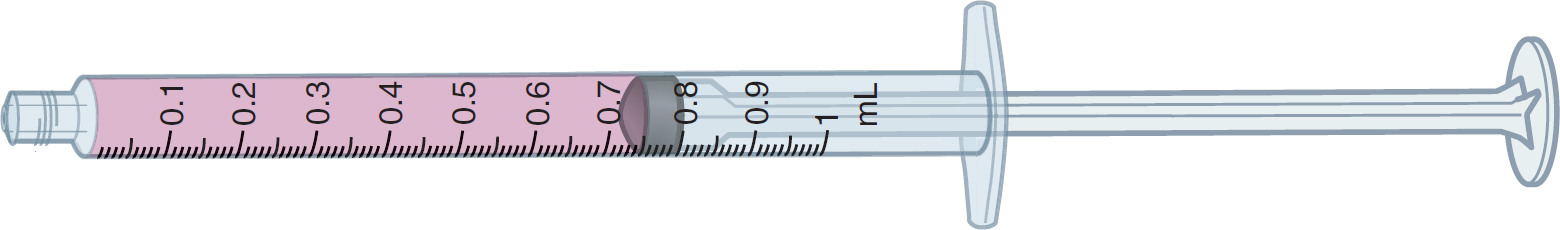 A 1 mL syringe containing 0.75 mL.An illustration of a 1-milliliter syringe without a needle in a horizontal position with the plunger on the right.