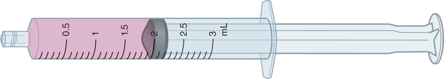 A 3 mL syringe containing 2 mL.An illustration of a 3-milliliter syringe without a needle in a horizontal position with the plunger on the right.