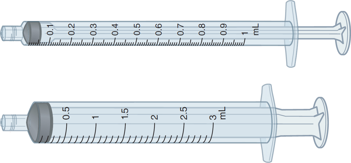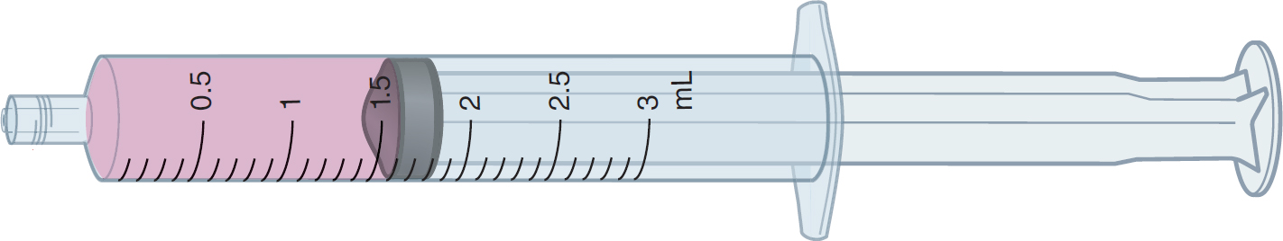 Medication administration sites, as well as the age of the patient and the size of the muscle, affect the volume that can be administered, as indicated in Table 9-1. The volume of medication that is required to deliver the prescribed dose determines the size of the syringe to be used for administering the dose. Calibrations on the syringe vary by syringe size, as shown in Table 9-2. The nurse will round the amount to administer, based on the calibration of the syringe required to administer the correct volume of medication. For example, if the amount to administer is less than 1 mL, then a 1 mL syringe can be used. The 1 mL syringe is calibrated by hundredths, so the volume to administer will be rounded to hundredths. The 3 mL syringe, however, is calibrated to tenths, so amounts larger than 1 mL will be administered in a 3 mL syringe and will be rounded to tenths (Table 9-3).