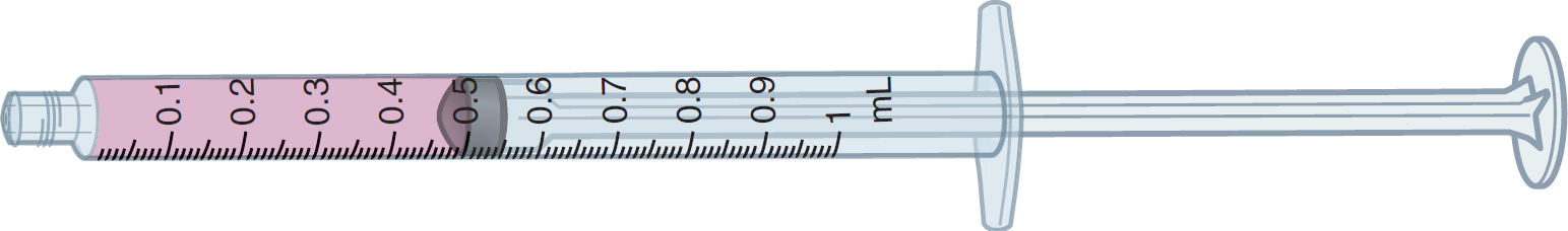 A 1 mL syringe containing 0.5 mL.An illustration of a 1-milliliter syringe without a needle in a horizontal position with the plunger on the right.
