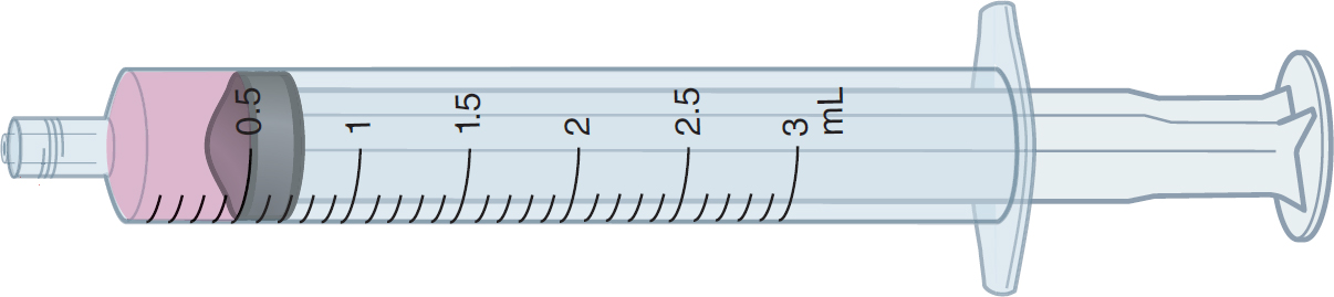 A 3 mL syringe containing 0.5 mL.An illustration of a 3-milliliter syringe without a needle in a horizontal position with the plunger on the right.