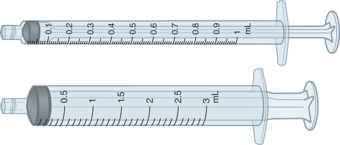 Less than 1 mL and does not calculate evenly to tenths e.g., 0.432 mL | 1 mL or smaller Calibrated in hundredths Use 1 mL syringe or 0.5 mL syringe. | Round to the nearest hundredth. Round to 0.43 mL. |