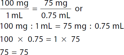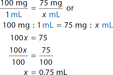 A calculation to set the ratio-proportion of the ordered dosage to administer. 100 milligrams over 1 milliliter equals 75 milligrams over 0.75 milliliter or a ratio of 100 milligrams to 1 milliliter equals a ratio of 75 milligrams to 0.75 milliliter. 100 times 0.75 equals 1 times 75. 75 equals 75. | A calculation to find the amount of ordered dosage to administer using the formula method. 75 milligrams over 100 milligrams times 1 milliliter equals 0.75 milliliter. In both the numerator and the denominator milligrams canceled each other. 75 milliliters over 100 equals 0.75 milliliter. 0.75 milliliter equals 0.75 milliliter. |