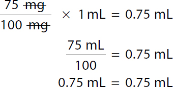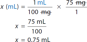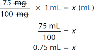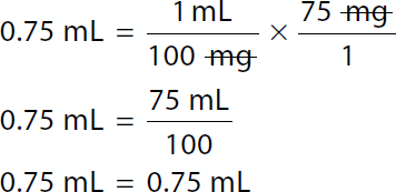 A calculation to confirm the amount of ordered dosage to administer using dimensional analysis. 0.75 milliliter equals 1 milliliter over 100 milligrams times 75 milligrams over 1. In both the numerator and the denominator milligrams canceled each other. 0.75 milliliter equals 75 milliliters over 100. 0.75 milliliter equals 0.75 milliliter. |