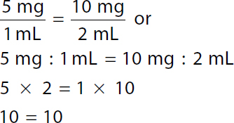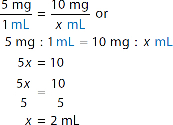 A calculation to set the ratio-proportion of the ordered dose to administer. 5 milligrams over 1 milliliter equals 10 milligrams over 2 milliliters or a ratio of 5 milligrams to 1 milliliter equals a ratio of 10 milligrams to 2 milliliters. 5 times 2 equals 1 times 10. 10 equals 10. | A calculation to find the amount of ordered dose to administer using the formula method. 10 milligrams over 5 milligrams times 1 milliliter equals 2 milliliters. In both the numerator and the denominator milligrams canceled each other. 10 milliliters over 5 equals 2 milliliters. 2 milliliters equals 2 milliliters. |