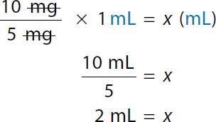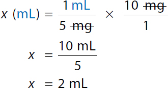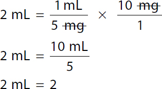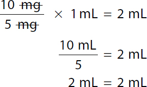 A calculation to confirm the amount of ordered dose to administer using dimensional analysis. 2 milliliters equals 1 milliliter over 5 milligrams times 10 milligrams over 1. In both the numerator and the denominator milligrams canceled each other. 2 milliliters equals 10 milliliters over 5. 2 milliliters equals 2. |