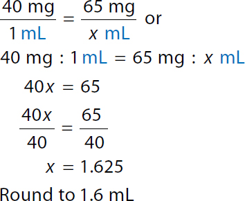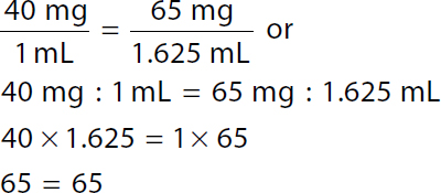 A calculation to set the ratio-proportion of the gentamicin ordered dose to administer. 40 milligrams over 1 milliliter equals 65 milligrams over 1.625 milliliters or a ratio of 40 milligrams to 1 milliliter equals a ratio of 65 milligrams to 1.625 milliliters. 40 times 1.625 equals 1 times 65. 65 equals 65. | A calculation to find the amount of ordered dose to administer using the formula method. 65 milligrams over 40 milligrams times 1 milliliter equals 1.625 milliliters. In both the numerator and the denominator milligrams canceled each other. 65 milliliters over 40 equals 1.625 milliliters. 1.625 milliliters equals 1.625 milliliters. Round to 1.6 milliliters. |