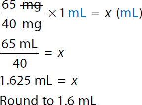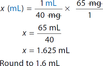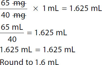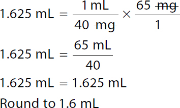 A calculation to check the amount of ordered dose to administer using dimensional analysis. 1.625 milliliters equals 1 milliliter over 40 milligrams times 65 milligrams over 1. In both the numerator and the denominator milligrams canceled each other. 1.625 milliliters equals 65 milliliters over 40. 1.625 milliliters equals 1.625 milliliters. Round to 1.6 milliliters. |