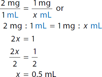 A calculation to set the ratio-proportion of the ordered dosage of lorazepam to administer. 2 milligrams over 1 milliliter equals 1 milligram over x milliliter or a ratio of 2 milligrams to 1 milliliter equals a ratio of 1 milligram to x milliliter. 2 x equals 1. 2 x over 2 equals 1 over 2. x equals 0.5 milliliter. | A calculation to solve the amount of ordered dosage of lorazepam to administer using the formula method. 1 milligram over 2 milligrams times 1 milliliter equals x milliliter. In both the numerator and the denominator milligrams canceled each other. 1 milliliter over 2 equals x. 0.5 milliliter equals x. |