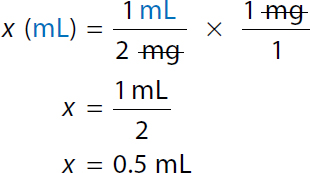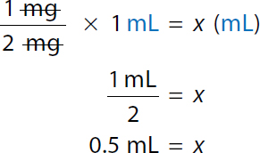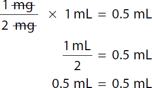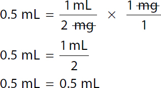 A calculation to check the volume of ordered dose to administer using dimensional analysis. 0.5 milliliter equals 1 milliliter over 2 milligrams times 1 milligram over 1. In both the numerator and the denominator milligrams canceled each other. 0.5 milliliter equals 1 milliliter over 2. 0.5 milliliter equals 0.5 milliliter. |
