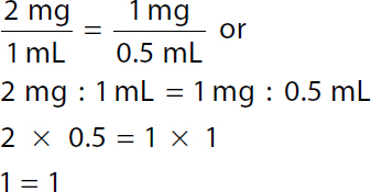 A calculation to set the ratio-proportion of the lorazepam ordered dose to administer. 2 milligrams over 1 milliliter equals 1 milligram over 0.5 milliliter or a ratio of 2 milligrams to 1 milliliter equals a ratio of 1 milligram to 0.5 milliliter. 2 times 0.5 equals 1. 2 times 0.5 equals 1 times 1. 1 equals 1. | A calculation to determine the amount of ordered dose to administer using the formula method. 1 milligram over 2 milligrams times 1 milliliter equals 0.5 milliliter. In both the numerator and the denominator milligrams canceled each other. 1 milliliter over 2 equals 0.5 milliliter. 0.5 milliliter equals 0.5 milliliter. |
