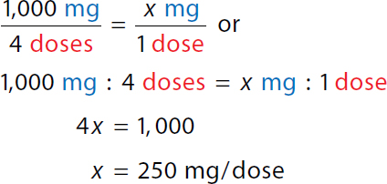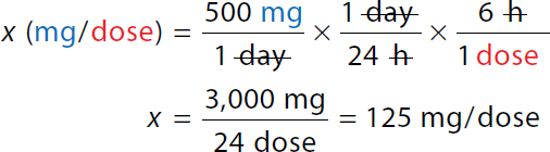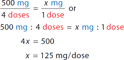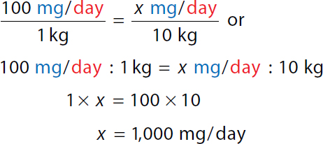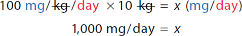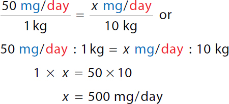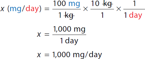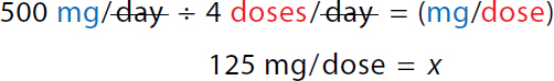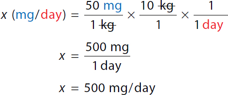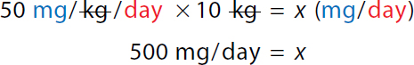 Minimum daily dose To calculate the value of x. Calculation reads, 50 milligrams over day over 1 kilogram equals x milligrams over day all over 10 kilograms or. A ratio of 50 milligrams over day to 1 kilogram equals a ratio of x milligrams over day to 10 kilograms. 1 times x equals 50 times 10. x equals 500 milligrams over day. Minimum single dose Calculation reads, 500 milligrams over 4 doses equals x milligrams over 1 dose or. A ratio of 500 milligrams to 4 doses equals a ratio of x milligrams to 1 dose. 4 x equals 500. x equals 125 milligrams over dose. | Minimum daily dose 50 milligram over kilogram over day times 10 kilogram equals x milligram over day. On the left-hand side, The numerator and denominator kilogram canceled each other. 500 milligrams over day equals x. Minimum single dose 500 milligrams over day divided by 4 doses over day equals milligrams over dose. On the left-hand side, The numerator and denominator day canceled each other. 125 milligrams over dose equals x. |