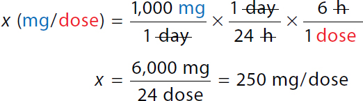 Maximum daily dose To calculate the maximum daily dose. x milligrams over day equals 100 milligrams over 1 kilogram times 10 kilograms over 1 times 1 over 1 day. On the right-hand side, The numerator and denominator kilogram canceled each other. x equals 1000 milligrams over 1 day. x equals 1000 milligrams over day. Maximum single dose To calculate the maximum single dose. x milligram over dose equals 1000 milligrams over 1 day times 1 day over 24 hours times 6 hours over 1 dose. On the right-hand side, both numerator and denominator day and hour canceled each other. x equals 6000 milligrams over 24 doses equals 250 milligrams over dose. |