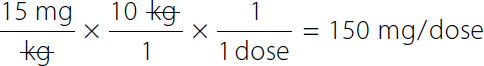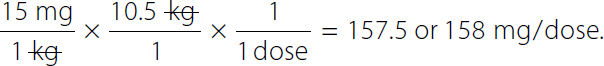 15 milligrams over 1 kilogram times 10.5 kilograms over 1 times 1 over 1 dose equals 157.5 or 158 milligrams over dose. On the left-hand side The numerator and denominator kilogram canceled each other.