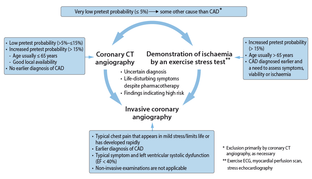 Investigation strategy guidelines for a patient with chest painwhen suspecting chronic obstructive coronary heart disease (CHD).