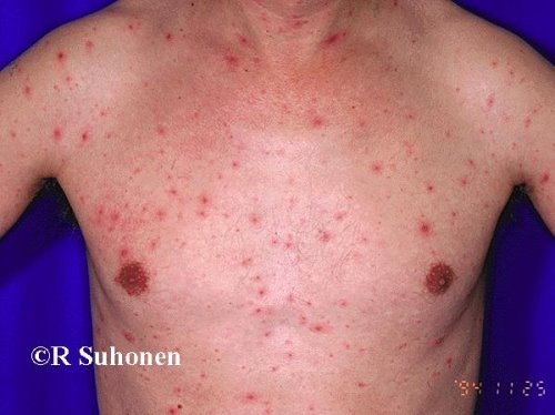 Chickenpox in an adult. Chickenpox can be a serious disease in the adult. The picture shows a mild case.
