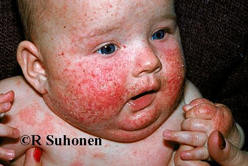 Atopic dermatitis on the facial skin of an infant. Atopic dermatitis in its "milk crust" form in a typical location on the face of an infant.