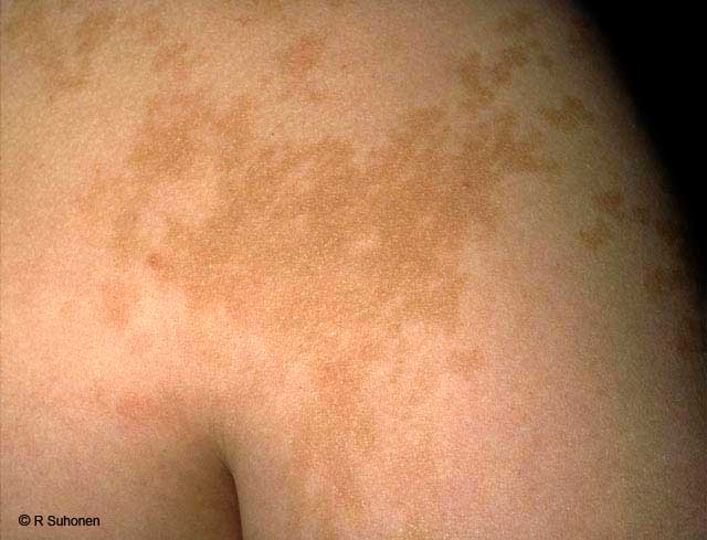 Becker's naevus. Becker's naevus (melanosis naeviformis Becker-Siemens) resembles pityriasis versicolor. The patch does not scale at all (when scraped), the periphery is "archipelago-like", and in boys the patch usually has a more pronounced hair growth than usual. See also pictures Becker's Naevus with Increased Hair Growth and Becker's Melanosis on the Back.