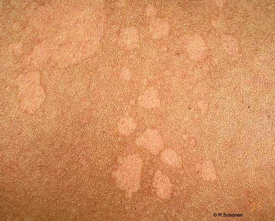 Close-up of pityriasis versicolor. Pityriasis versicolor may also be lighter than its surroundings. It reduces skin pigmentation in the patches in summer. When the patches are treated, the skin remains variegated. The reduced pigmentation is not permanent.