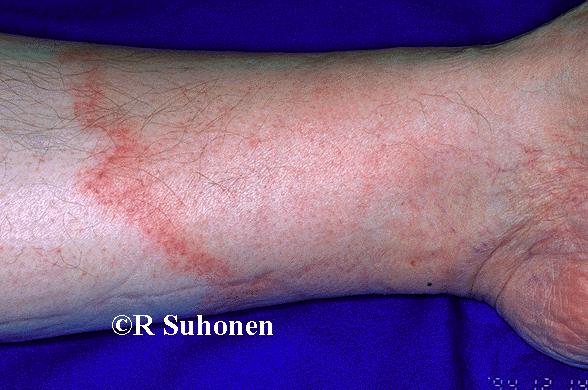 Erythema migrans (Lyme borreliosis) on the leg. The reddish margin moves proximally. There is sligh erythema on the distal area and no itching. In this patient, Borrelia titers were high and the response to antimicrobial therapy both clinically and serologically rapid. There was no known tick bite and the skin lesion was detected in December. This reflects the deviations of borrelial diseases from any fixed schedules.