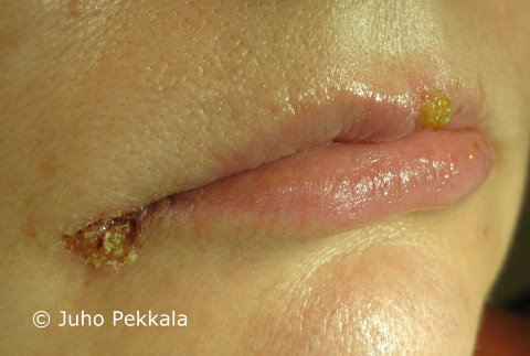 Labial herpes. Active labial herpes in the corner of the mouth and on the upper lip.
