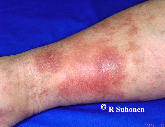 Eczema on the lower leg due to venous insufficiency. The first sign of venous insufficiency in the lower leg is usually swelling, followed by eczema. If the swelling is not treated with appropriate bandaging, compression stockings or surgery + compression stockings, the eczema will not heal and the patient is at risk of a leg ulcer.