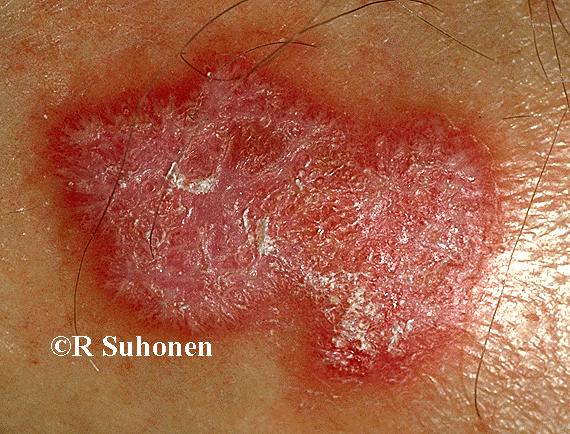 Lichen planus. Chronic, hypertrophic patch of lichen planus on the skin of the extremities. The aetiology of lichen is unknown. In the thickest forms potent corticoids with occlusion are needed for cure.