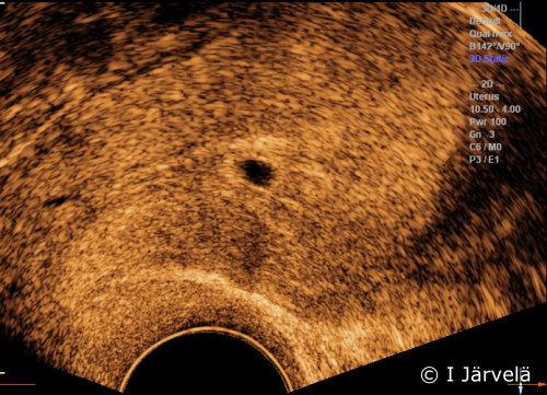 Incipient miscarriage. Incipient miscarriage in pregnancy week 5+4. Note: yolk sac cannot be detected (cf. pictures Pregnancy Week 5 (Ultrasound Scan) Pregnancy Week 6 (Ultrasound Scan)).