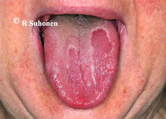 Geographic tongue. The aetiology of geographic tongue, also known as benign migratory glossitis, is unknown and therefore no specific treatment is available. There are well-circumscribed areas with loss of papillae, often surrounded by a light-coloured margin. The lesions change place, sometimes even on a daily basis. People with psoriasis may have similar changes.